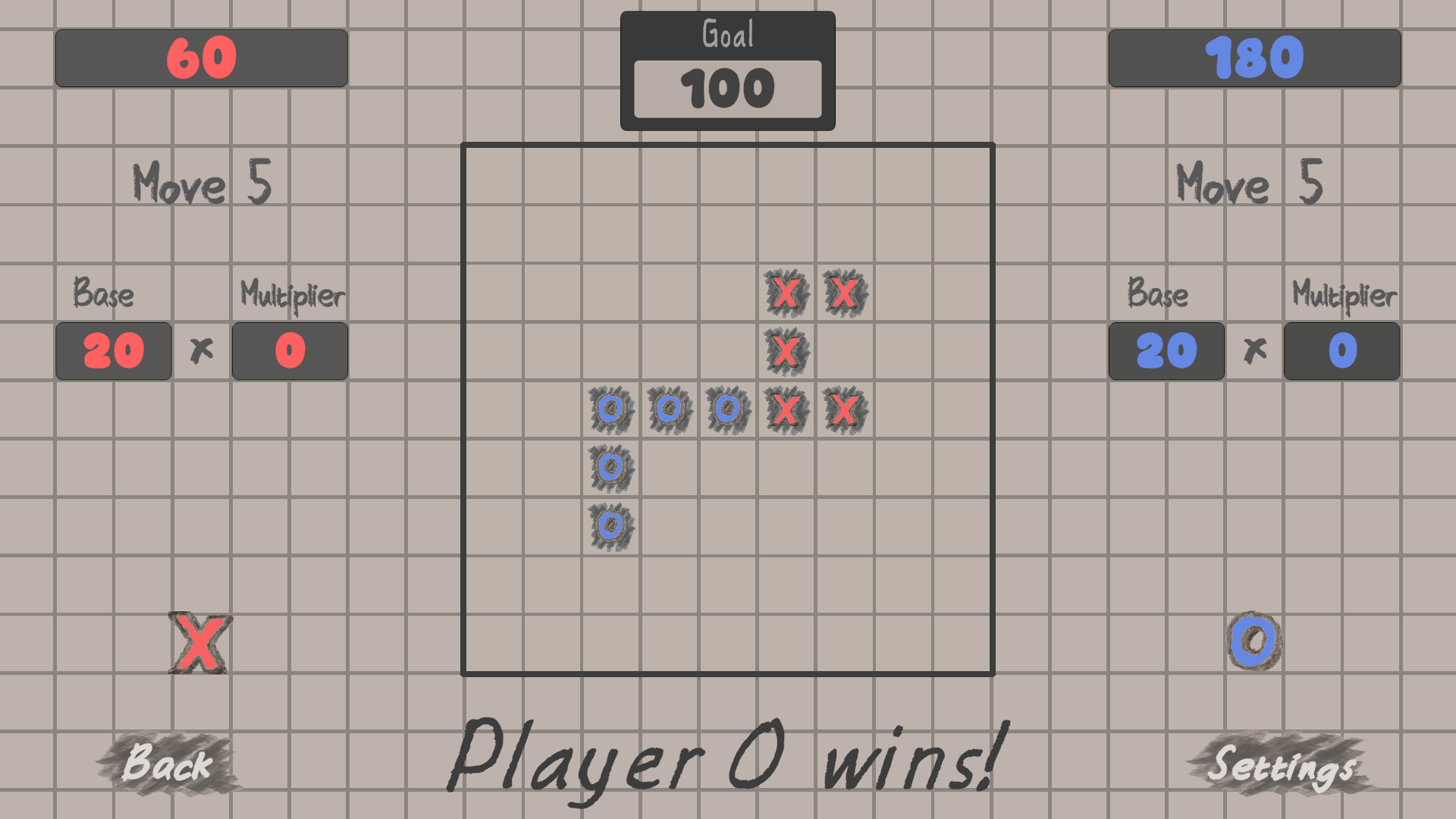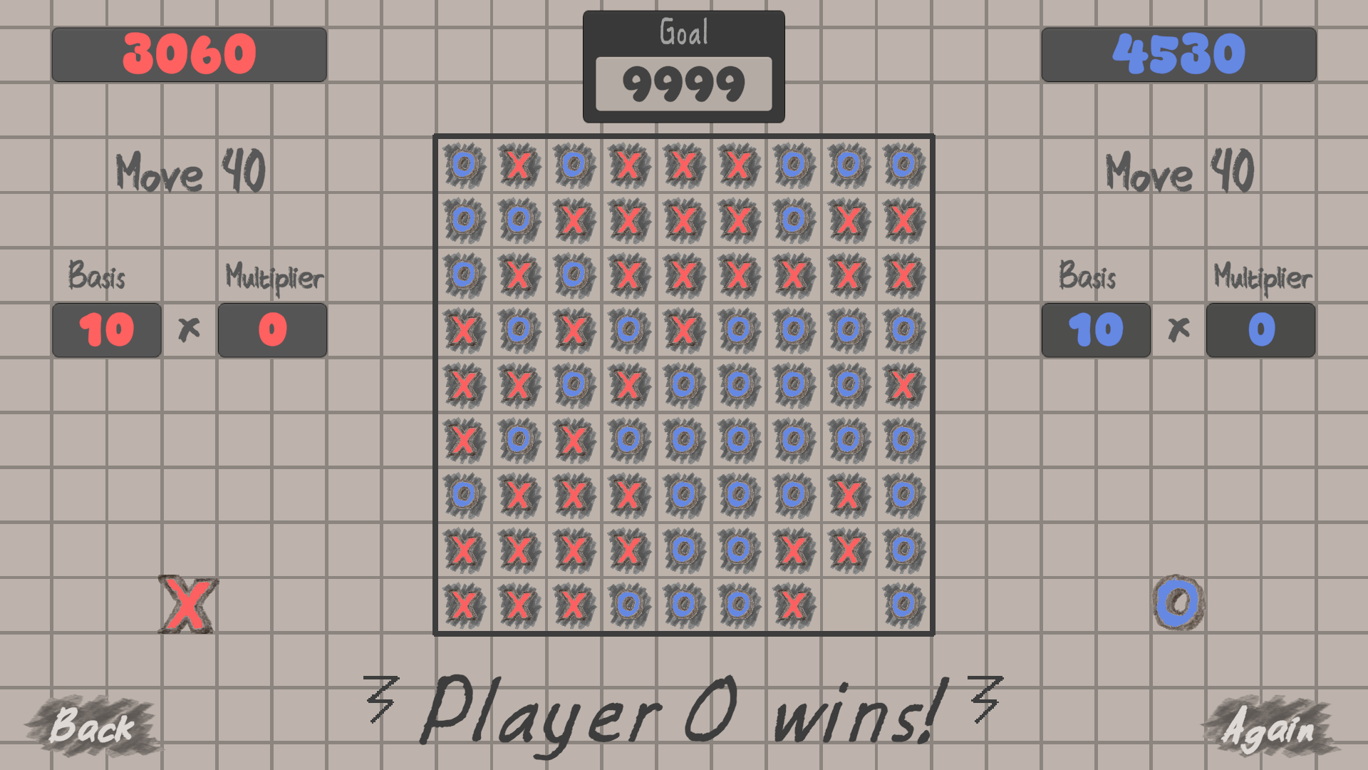 Within a 9x9 field you gonna make score with one, two, three or even four rows of your character to archive the defined goal. The score is depend on where you place your character. So, choose it wisely!
